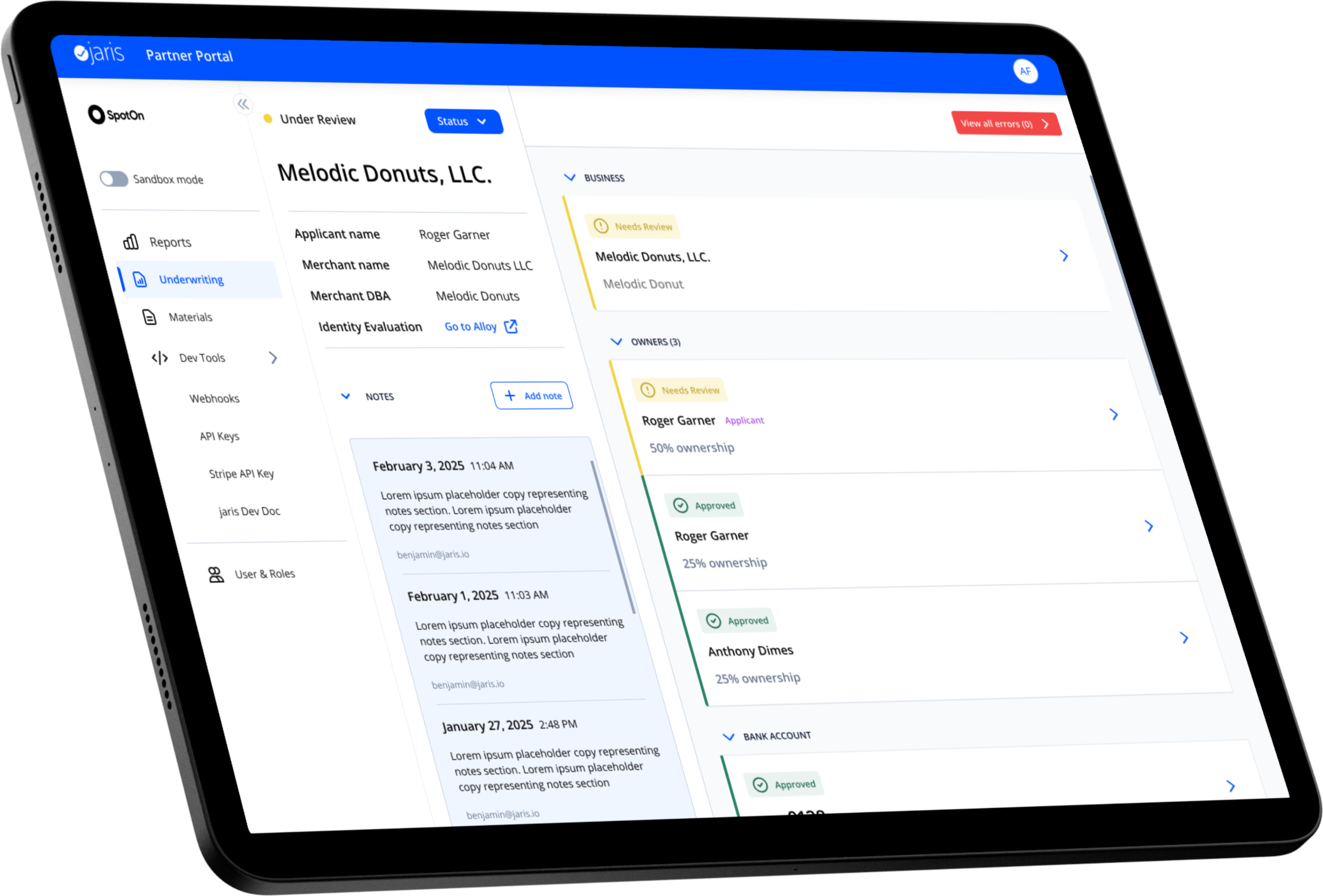 I continued to champion the importance of clear information hierarchy throughout the design process when tackling the rest of the underwriting workflow. In this key part of the user flow, we needed to show Partners all of the variables that they would need to make a decision. These included application fields, uploaded documents that may have been required to further verify specific information, notes written by their teammate or our internal jaris staff to highlight additional details on the merchant, as well as outcome tags that were driven by Alloy, a 3rd party service that conducted identity verification, fraud prevention, and compliance (KYB/KYC) automation. These outcome tags allowed our operations team to understand any potential warnings, as well as show what passed or downright failed. These helped operations drive error handling, approving or rejecting applications.